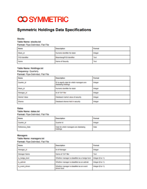 The Symmetric Holdings Data Feed provides clients with direct data access to the historical 13-F data. Users can use the holdings feed to build upon our factor work, or perform their own research. Key attributes: